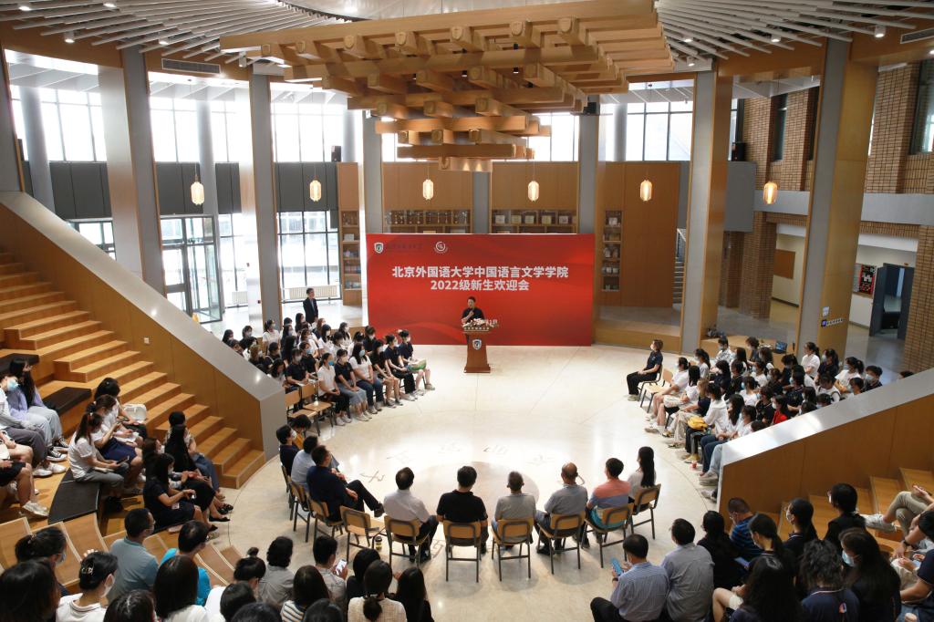 在庄严的国歌声中,迎新大会正式开始。2022级本科生叶峻峤、研究生刘晓璇和博士生梁心泉作为新生代表发言,分享她们对新生活的憧憬与喜悦。叶峻峤同学展望未来四年的学习生活,号召同学们学会独立自主,以乐观开放的心态克服茫然,通过自身所学让世界了解中国;刘晓璇同学心怀热忱,重新出发,渴望在更高的学习平台上全面发展,发挥自身特长,传播中国声音;梁心泉同学立志夯实学术基础,扩展国际视野,提升综合素质,燃烧自己为祖国的教育文化大事业发光发热。