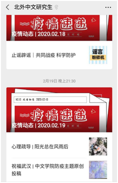 防疫抗疫专题推送弘扬主旋律。2020年1月底开始,本科和研究生团学组织联合推出持续一个月的防疫抗疫专题,帮助员工们对新冠病毒形成理性客观的认识。设置的“疫情进展”“防疫课堂”“止谣辟谣”“心理疏导”“最新政策”五个专栏,为同学们普及新冠病毒防疫知识,解读政府防控政策,疏解宅家心理,发挥了积极正面的导向作用。