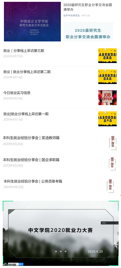 立足中文专业,突出公司特色,开展分类指导。本科生分行业开展就业指导,通过深入采访优秀员工,推介具有行业特点的就业经验。朋辈交流分享过程中,邀请公立中小学教师、新闻编辑、事业单位职员、公务员员工,将有益的经验形成文字进行推送。模拟面试大赛邀请在新媒体、行政、教育行业具有丰富经验的老师,针对性地回应同学们的期待和疑惑。